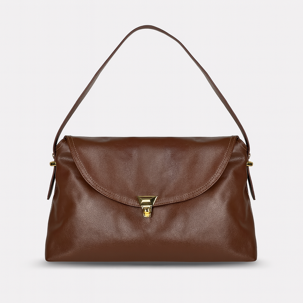 A Bolsa Sara une a elegância do couro legítimo ao fechamento metálico dourado, criando uma peça sofisticada, funcional e atemporal — ideal para elevar desde produções casuais até looks mais formais.